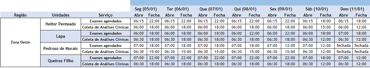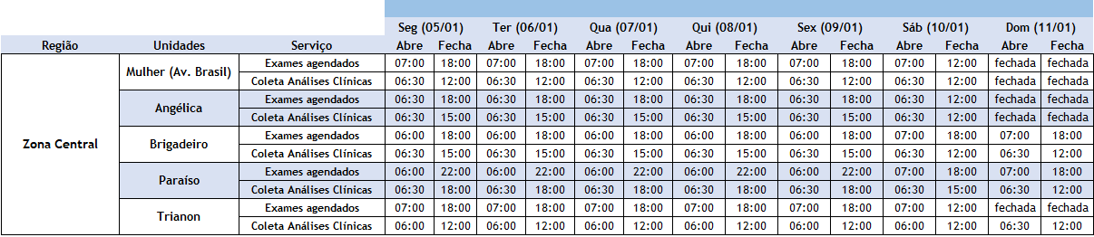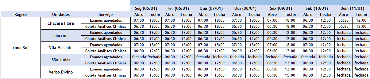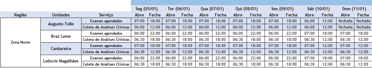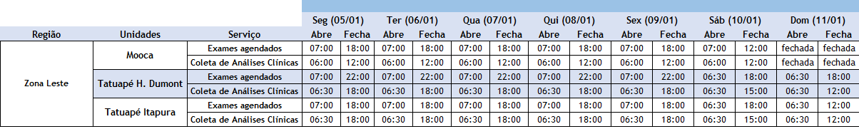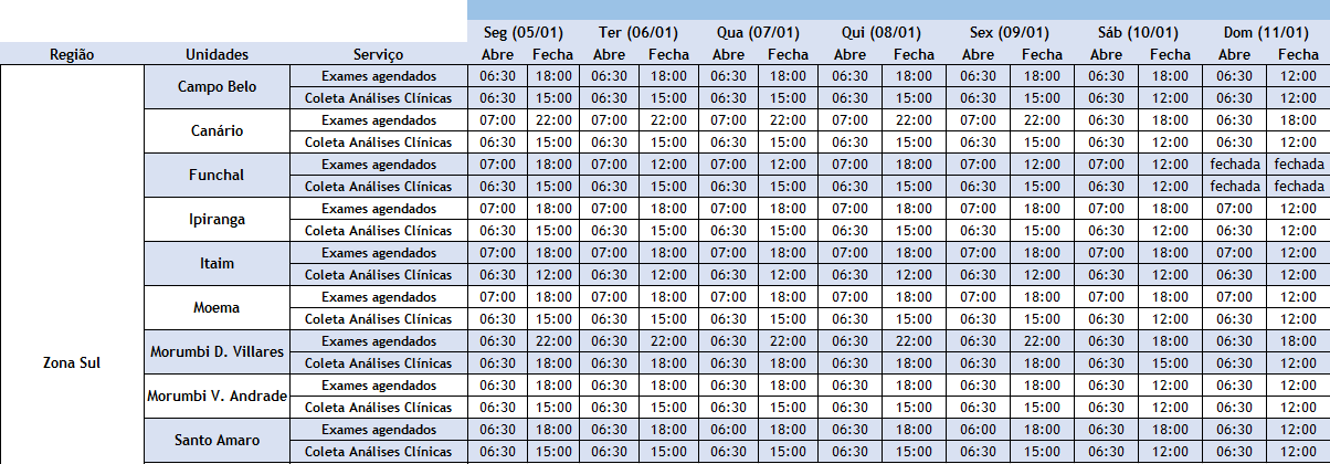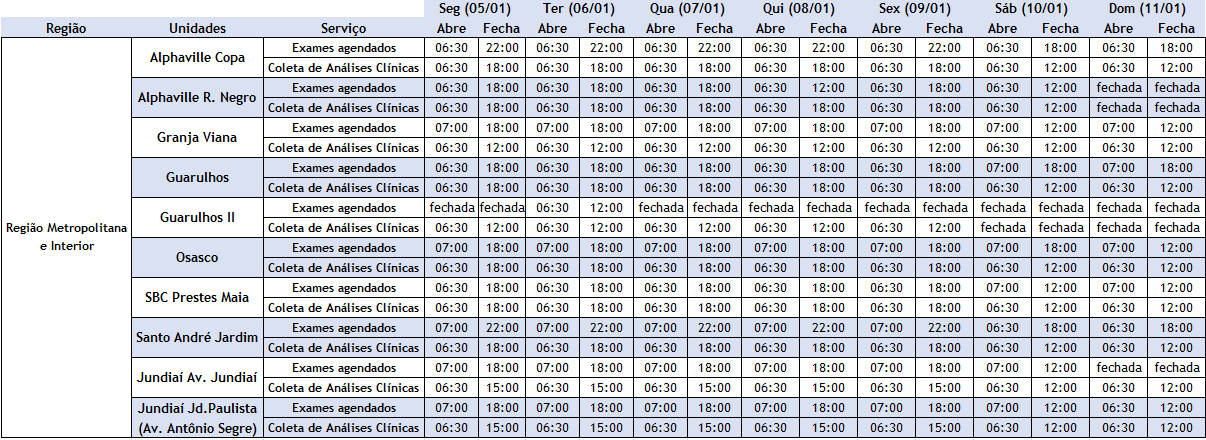 Exames, vacinas e maisConfira os horários de atendimento das nossas unidades durante as festas (05/01/26 a 11/01/26). Clique na tabela para uma melhor visualização: